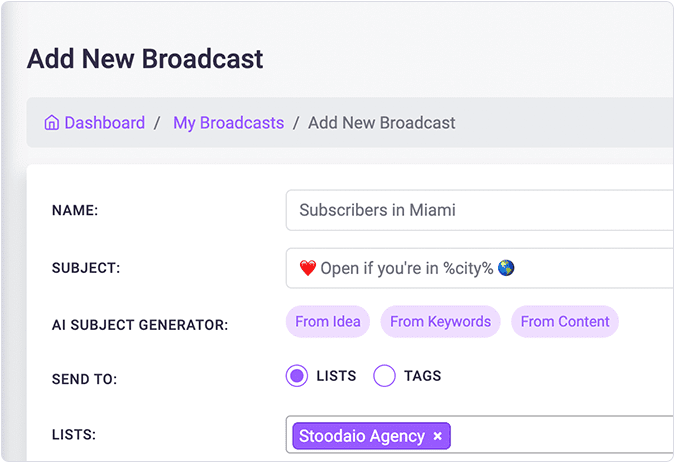 • Create Unlimited One-Time Broadcast Campaigns/month For Email, Text and FB Messenger